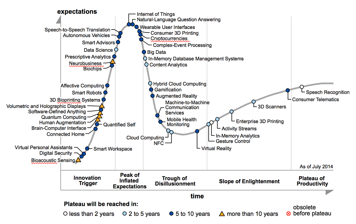 Naturalment, l’autora circumscriu el seu cicle a l’any 2013. Si hagués continuat, al 2014 s’hauria trobat que un cicle semblant es repeteix una vegada (o més) cada any, sempre amb cim que sol coincidir amb l’11/9. El que no tinc clar és com encadenar els diferents hypes anuals i a quina escala relativa hauríem de pintar les figures consecutives. Una corba d’expectatives que s’adiu més al tema habitual d’aquesta columna és la següent, també dissenyada i il·lustrada per Gartner i publicada en un blog de l’Economist amb el títol Divining reality from the hype: The 2014 Gartner hype cycle chart, with all technologies identified (27 Aug. 2014, disponible –em temo que només per a subscriptors– a l’Economist.)